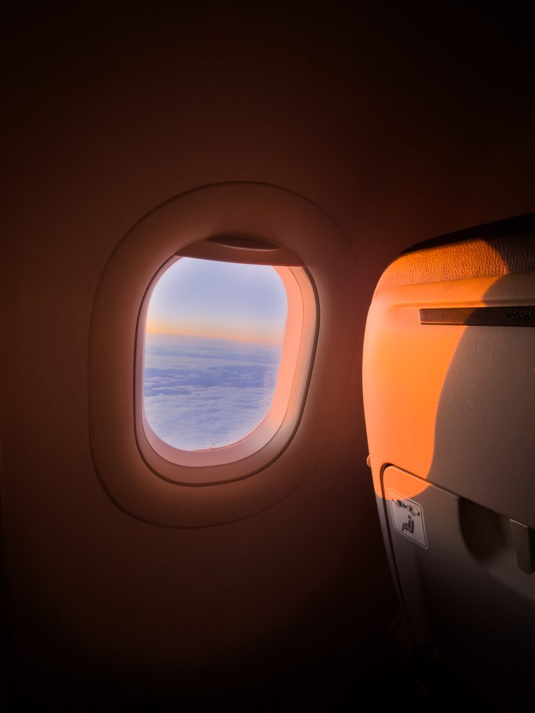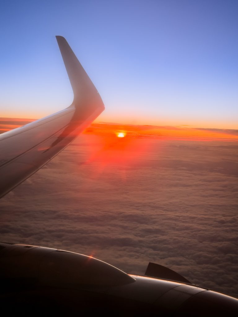 Podczas lotu wykonaliśmy serię zdjęć przedstawiających panoramę chmur, skrzydło samolotu oraz spektakularny wschód słońca widziany z wysokości przelotowej. Tego typu kadry doskonale oddają klimat podróży i pokazują piękno krajobrazu obserwowanego z powietrza.